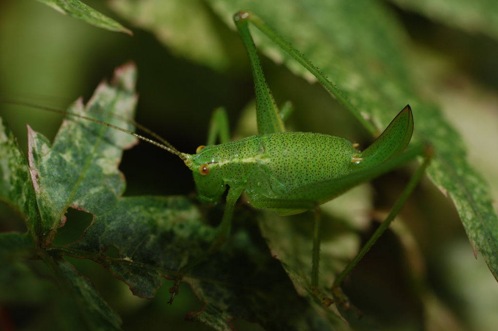 Die grüne Heuschrecke fiel auf den panaschierten Blättern von /*Acer palmatum Shindeshojo*/ überhaupt nicht auf