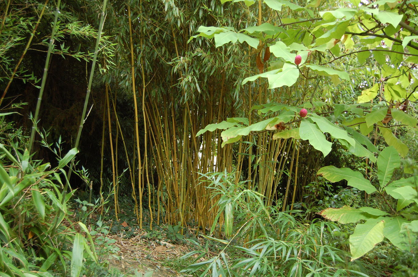 mit Phyllostachys aureosulcata Aureocaulis und den feuerroten Früchten der /*Magnolia tripetala*/#AM