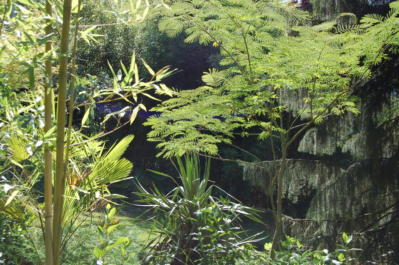 /*Albizzia julibrissin*/ vor Picea breweriana und neben Trachycarpus und Phyllostachys 'prominens'