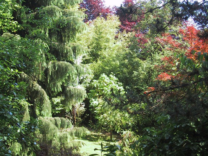 Quercus ilex,Picea breweriana,Phyllostachys nigra boryana,Quercus dentata pinnat. u. vorne re Viburnum odoratissimum Awabuki