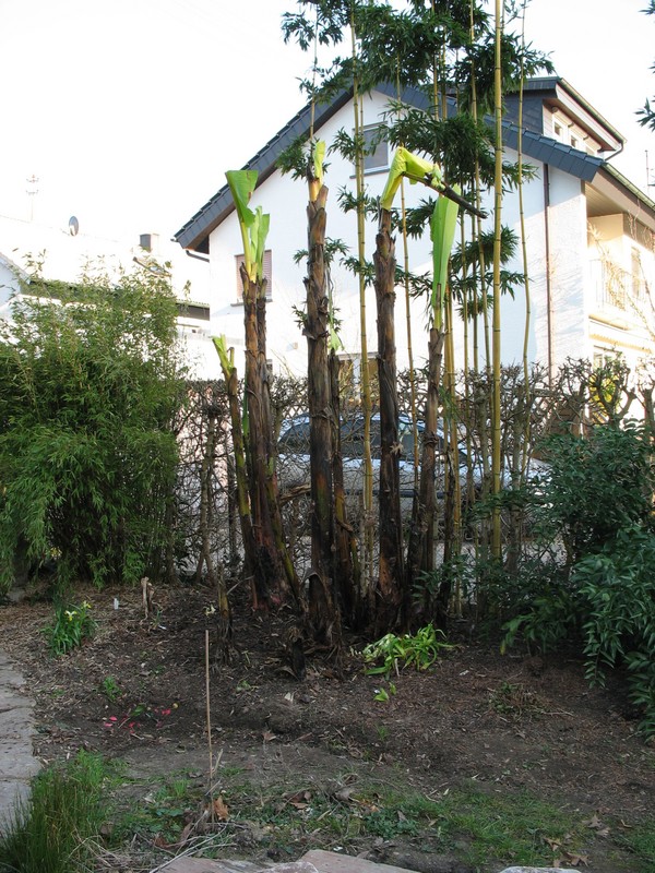 M. sikkimensis zeigt äußerlich kein Grün (siehe vorheriges Foto im Vordergrund). Aber die Stämme sind intakt (der höchste mit 175 cm) trotz gammeligem Aussehen. Ganz so hart und vital wie die M. basjoo zeigt sich M. sikkimensis bei mir nach vielen Jahren des Auspflanzens nicht.