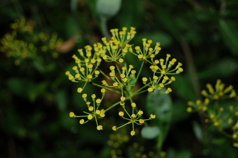 /*Bupleurum fruticosum*/ blüht etwas unscheinbar, wirkt aber auch im Winter durch seine graublauen immergrünen Blätter dekorativ