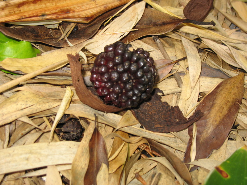 die Pflanze ist oberirdisch längst vergangen. Alles was übrigblieb von Sauromatum venosum ist der stiellose kugelige Fruchstand am Boden.