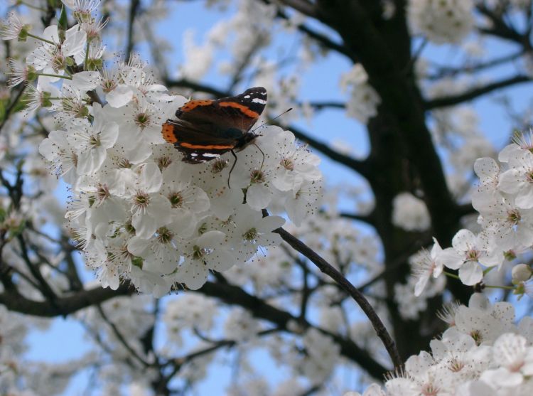 Ein Schmetterling sonnt sich auf den Blüten einer Zwetschge