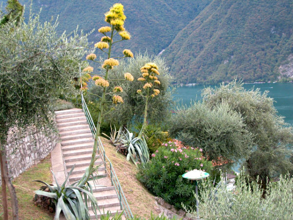 die 2 unten stehenden Bilder wurden gestern am Luganersee von Gabriel, einem Tessiner Exotenfreund, gemacht. Sie zeigen 2 blühende Agave americana. A. americana gedeiht im südlichen Tessin problemlos, die Blüte ist jedoch, im Gegensatz zum Mittelmeergebiet, ein nicht alltägliches Ereignis. Auf dem 1. Bild erkennt man noch div. Olivenbäume sowie einen Oleander.