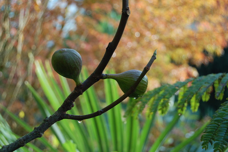 /*Ficus carica*/ mit Herbst-Tränen vor Trachycarpus und Acer palmatum Seiryu