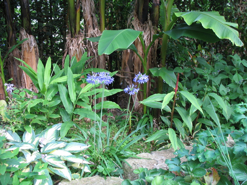 Agapanthus-Headborne-Hybride mit div. Ingvern vor dem wiedererstandenen Musahain. Ein reines Sommermotive - eine der wenigen Flächen bei mir auf der es im Winter kaum was zu sehen gibt.