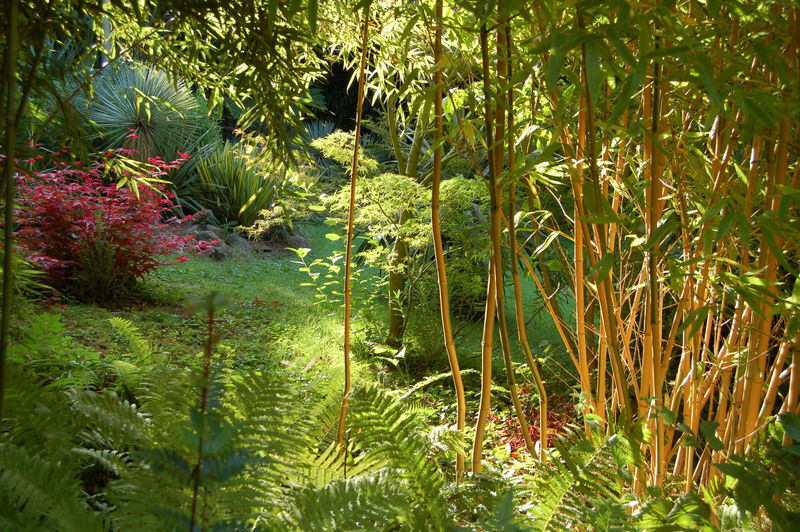 Unwirklich orangegelb leuchten in der Morgensonne die Halme von /*Phyllostachys bambusoides Castillonii*/