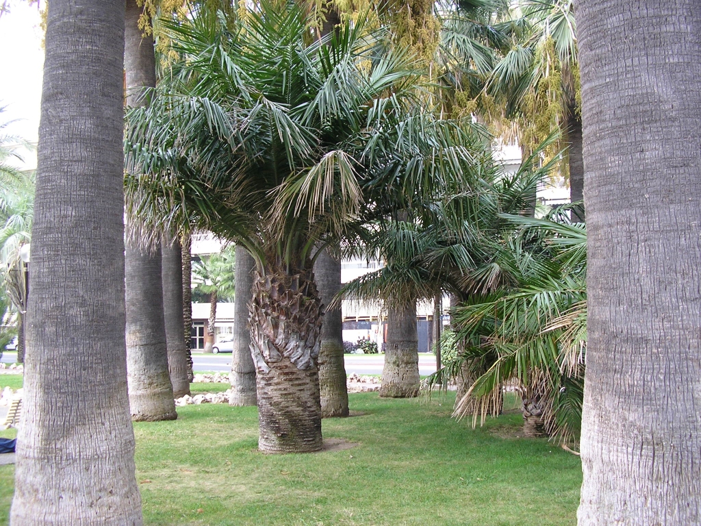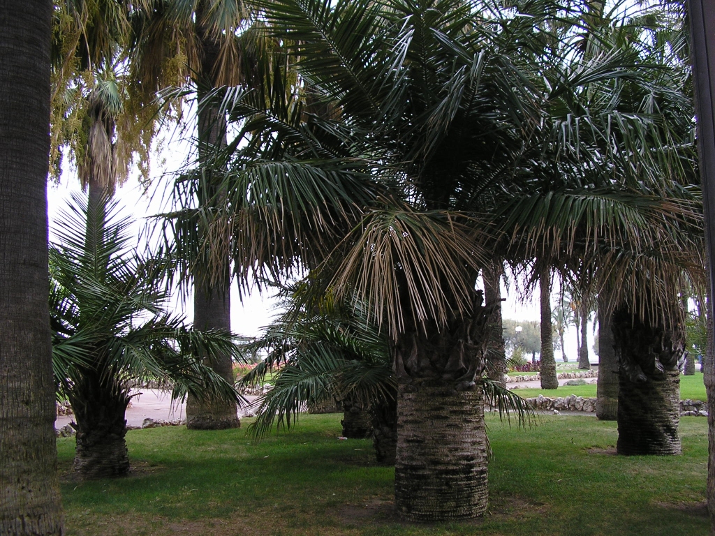 Erst dieses Jahr sind mir die kleinen bis halbstarken Jubaea chilensis aufgefallen. Wer mag sich etwas dabei gedacht haben, diese so eng zwischen schon große andere Palmen gepflanzt zu haben. wenn ich richtig gezählt habe sind es fünf auf engem Raum, Planung??