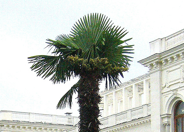 ja, man sieht deutlich, dass ob die vordere /*Trachycarpus fortunei*/-Palme mit offenbar männlichen (gelben) Blüten besetzt ist. Hier eine Ausschnittsvergrößerung.