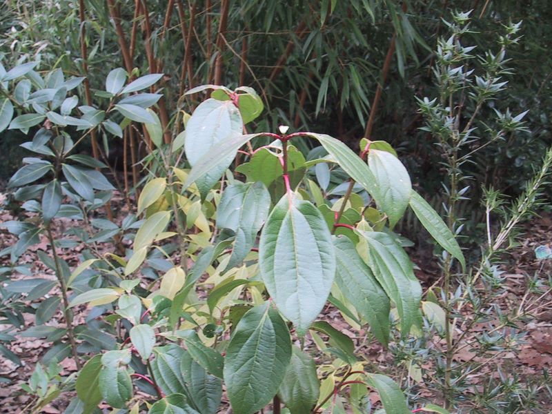 Scheint fast so hart wie der ähnlich aussehende Vib.davidii zu sein :/* Viburnum cinnamomifolium*/,hier zwischen Osmanthus decorus li und Osmanthus heterophyllus re. Im Hintergrunf Phyllostachys vivax aureocaulis.In England gibt es von dieser Vib.art wunderschöne großlaubige BÄUME!!!!