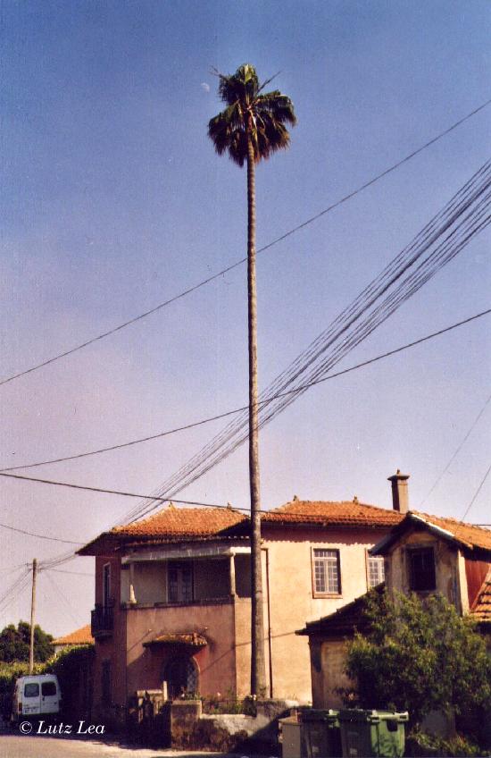 Diese regelrecht in den Himmel wachsende Washingtonia-Palme gedeiht vor einem leerstehenden Haus bei dem Ort 'Granja' ca. 30 km südlich von 'Porto'. Die bestimmt über hundert Jahre alte und gut 30 m hohe Palme ist das Wahrzeichen des Dorfes und schon von weit her sichtbar. Da jene in nicht weiter Entfernung zum Atlantik wächst, ist sie oft starken Stürmen ausgesetzt und wiegt dann immer stark hin und her. Dies konnte ich schon beobachten!