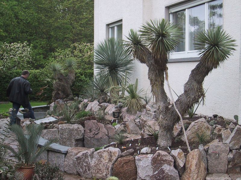 Yuccagruppe aus anderer Perspektive (idealer Pflanzort direkt an der Hauswand mit exzellenter Drainage)