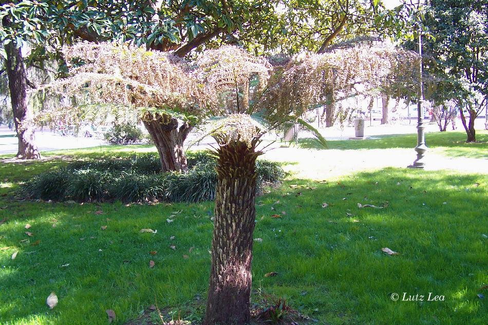Tasmanischer Baumfarn im "Sommerpark" mit nur leichten Frostschäden. Im Hintergrund eine stattliche 'Eriobotrya japonica' (Japanmispel).
