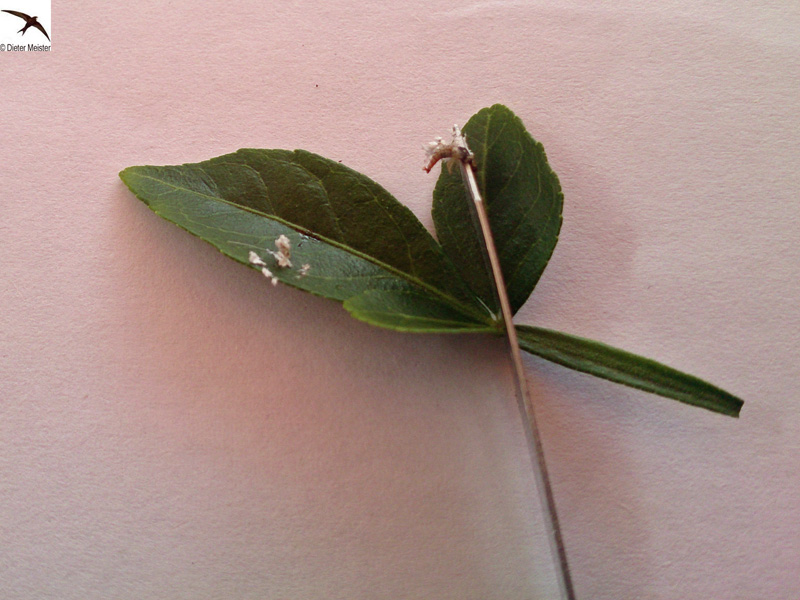 Ich konnte von diesen an 4 Stellen an den Blättern feststellen.Es sah aus wie kleine Wattestäbchen und beim genauen hinschauen bewegte es sich im inneren.
