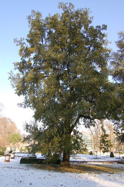 Im Palmengarten Frankfurt (Nordmauer), sie dürfte ca 10-12m hoch und mindestens 70Jahre alt sein. Deutlich älter und höher ist die im pic gezeigte Quercus X hispanica Lucombeana (habe leider niemanden gefunden, der mir Auskunft geben konnte.Ich schätze aber ,dass sie gut 20m hoch sein dürfte und ca 100j u. mehr? alt sein dürfte.Also nix für den Vorgarten ;-))