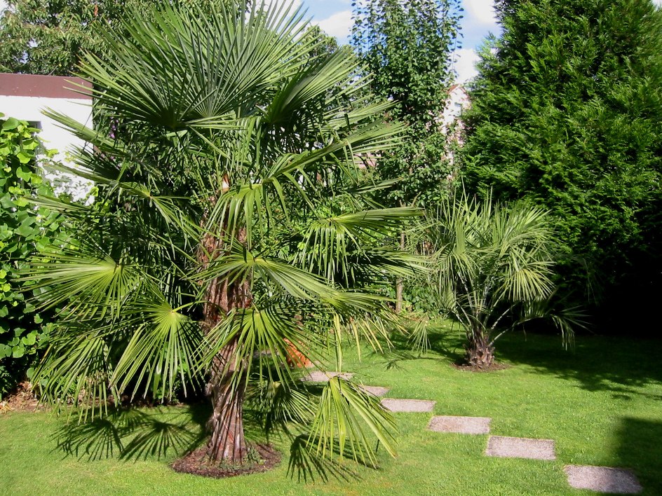 Die Trachy wurde im März 2000 mit 40cm Stamm gepflanzt / die Butia im April 02 mit 1,5m Gesamthöhe.