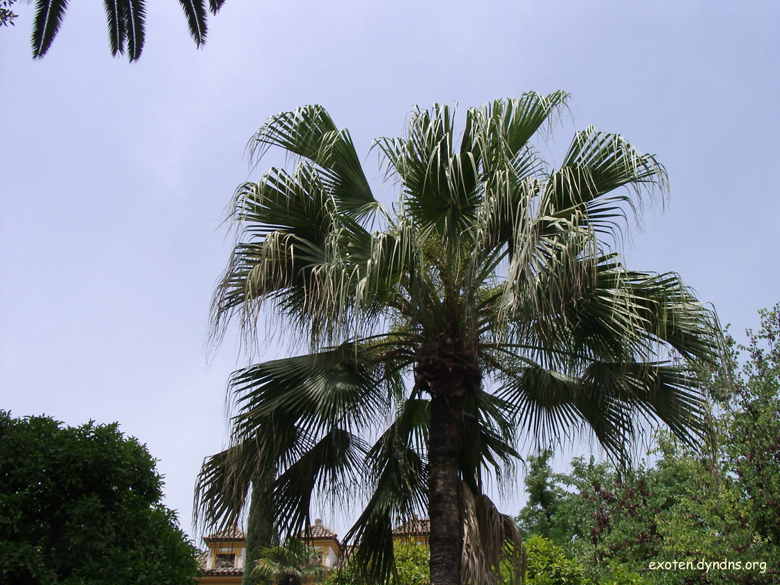 /*Livistonia chinensis*/ sieht man in Sevilla durchaus öfters, sie kommt mit dem Klima dort gut zurecht. Bei flüchtigem Blick kann man sie leicht mit Washingtonia verwechseln, untrügliches Zeichen sind u.a. die innerhalb der Krone liegenden Blüten/Fruchtstände. Die Livis trugen schon Fruchtansatz, während die Washis erst blühten