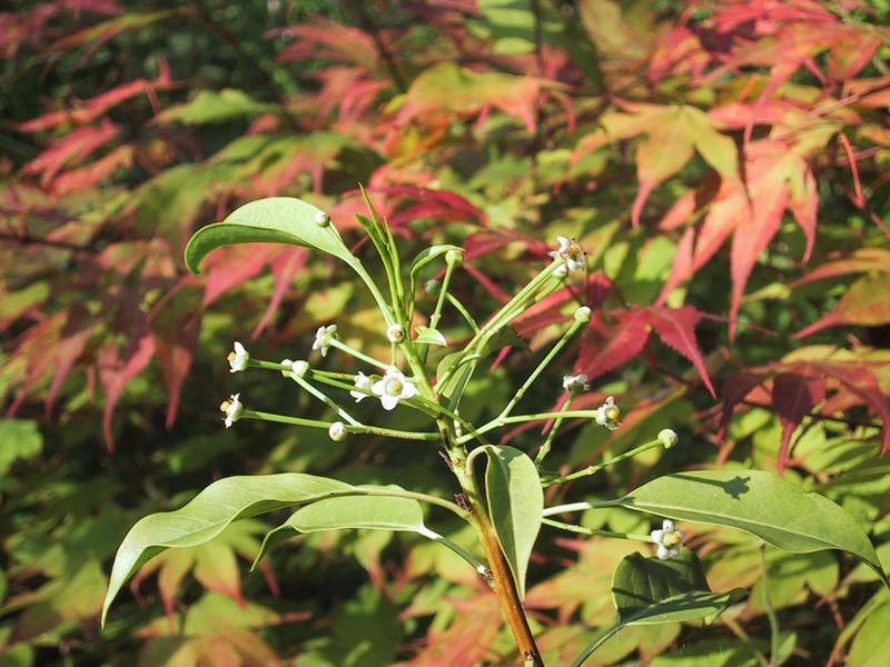 Ilex pedunculosa-Blüten vor Acer Palmatum Tsuma Beni