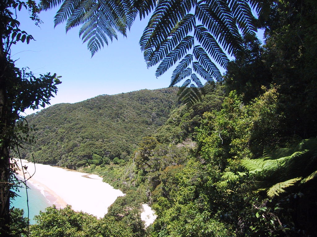eine der schönsten Küstenurwälder findet man im Abel Tasman National Park, im Nordwesten der Südinsel (goldgelber feinster Sandstrand,Palmen, Baumfarne, Sandflöhe !!!!!
