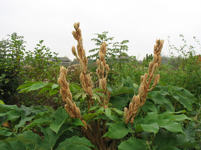 weil der Blütenstand von /*Tetrapanax papyrifera 'Rex'*/ einfach so eindrucksvoll ist. Wenn das nicht Exotisch ist!