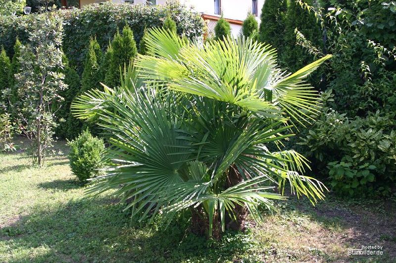 Diese Gruppe habe ich im Winter nur ganz primitiv mit einer Plane nach oben hin gegen Niederschläge geschützt. Die Plane war seitlich offen. Die Rußlandkälte mit zwei Nächten mit -18°C gepaart mit eisigem Sturm hat dieser Gruppe überraschenderweise nur wenig zugesetzt. Ich musste natürlich viele Blätter abschneiden, die rissig waren und braune Spitzen hatten, die Palmen haben sich aber super erholt. Übrigens: Diese Gruppe wurde NICHT gemulcht und unter der zeltartig angebrachten Plane gab es auch keinen Schnee, d.h. der Boden war beinhart gefroren.