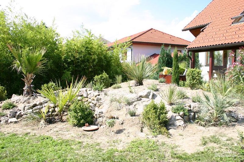 Neu angelegter Trockenhügel. Rechts seit eineinhalb Jahren ausgepflanzte Chamaerops humilis var. cerifera (daneben eine kleine Trithrinax campestris), links Washingtonia filifera (3. Jahr ausgepflanzt, heuer auf den Hügel umgepflanzt im Sommer) und im Vordergrund Nannorrhops ritchiana, am Hügel einige Dasylirions.
