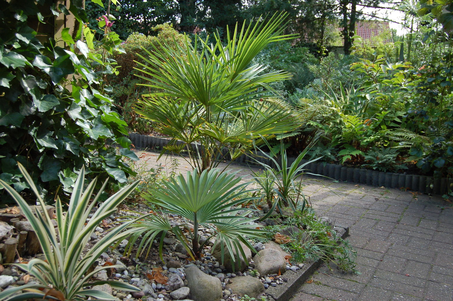 /*Trachycarpus takil*/. Tr. princeps und vorne die seltene Yucca filamentosa Albovariegata*/#AM