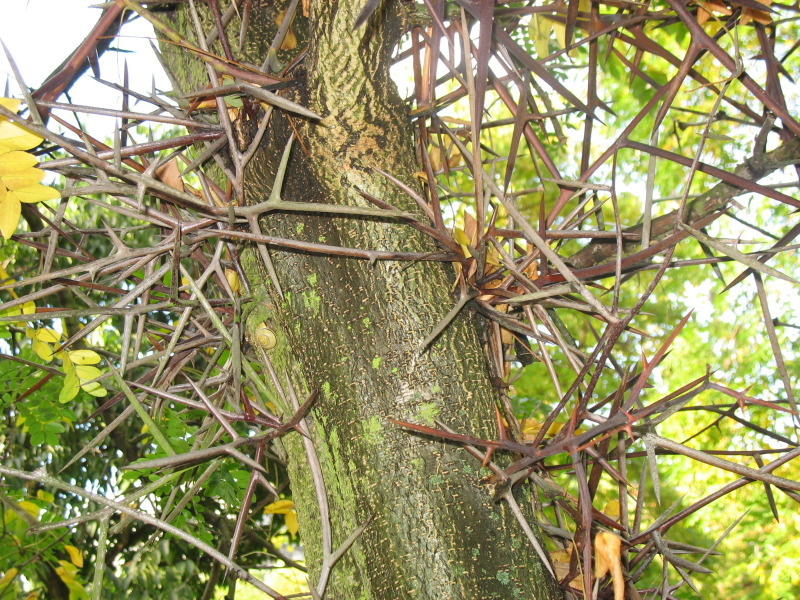 Gledisia macracantha aus Zentralchina beeindruckt nicht durch die Dichte sondern der Länge seiner verzweigten Stacheln. Der längste hatte nahezu einen Meter!