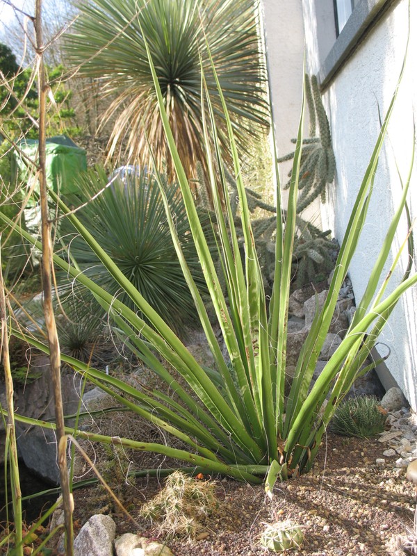 Hier Hesperaloe funifera, deren Rosette nach 4 ungeschützten Standjahren eine Höhe von 110 cm erreicht hat. Fehlt nur noch eine Blüte zum vollkommenen Glück!