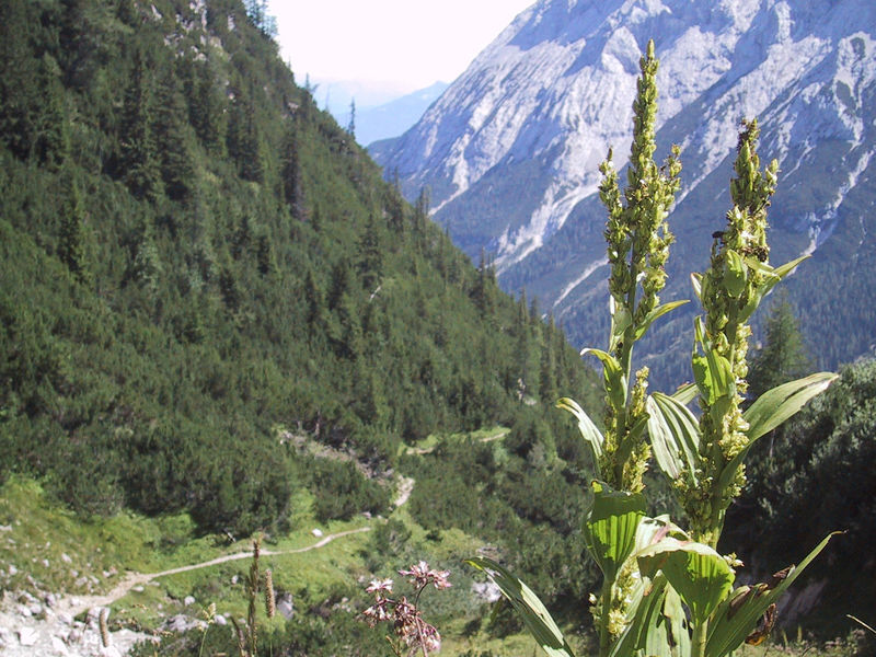 Vom Vieh wegen starker Giftigkeit gemieden, im Flachland durch Schneckenfraß gefährdet: /*Veratrum album*/,der weiße Germer