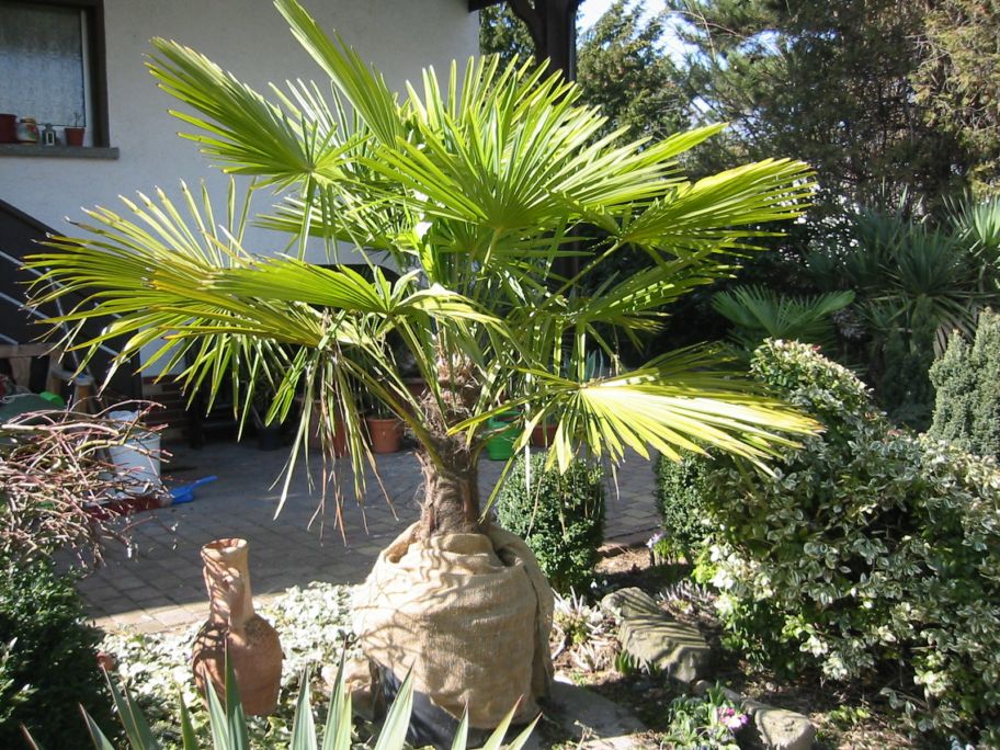 Trotzdem hat sie den Winter völlig im Freien mit durchgefrorenem Kübel sehr gut überstanden. Geschützt wurde nur mit einem Kartoffelsack, somit hat diese Hanfpalme eine sehr gute Winterhärte bewiesen!
