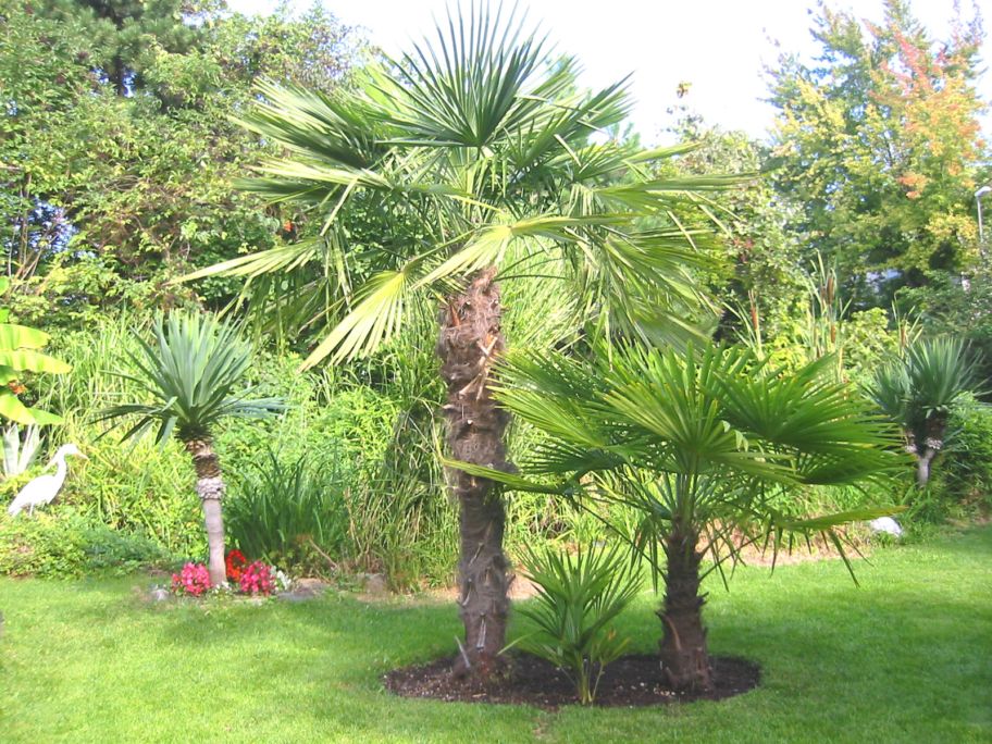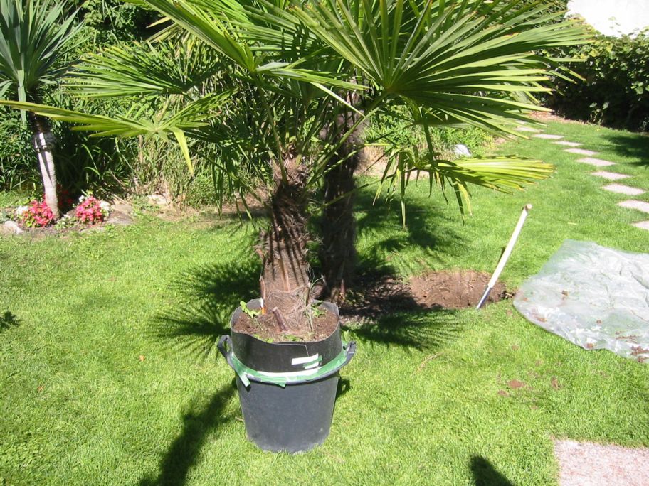 Ich entschied mich diese und noch eine kleine selbstgezogene Hanfpalme neben eine Trachy zu pflanzen die seit März 2000 ausgepflanzt wurde.