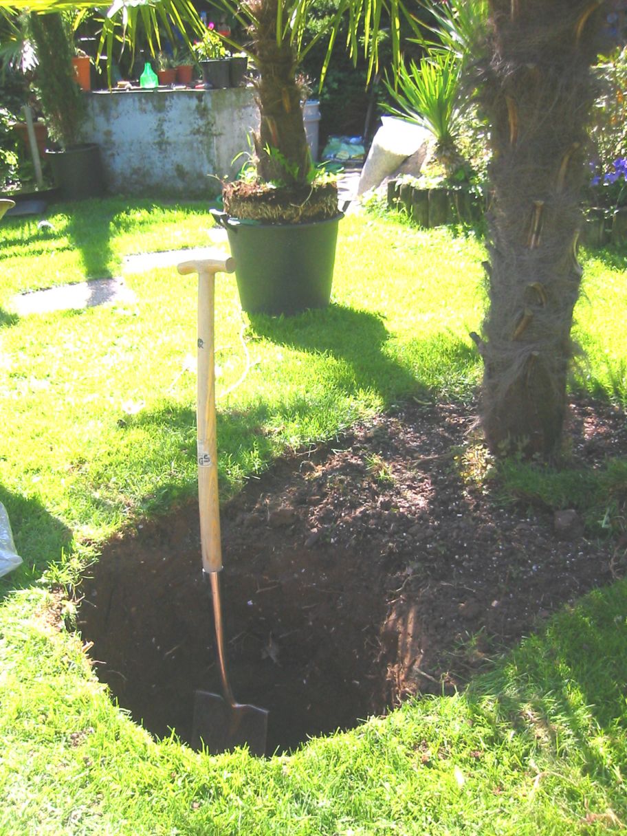 ein Loch von 1m Tiefe zu buddeln war gestern in der Mittagssonne recht schweißtreibend! Und auch hier wäre es besser für mich und die Palme gewesen, das ganze im März oder April getan zu haben. Man beachte im Hintergrund den Wurzelüberstand am Kübel, der inzwischen 15cm betrug! Nochmal wäre die Überwinterung wohl im Kübel nicht gut gegangen.