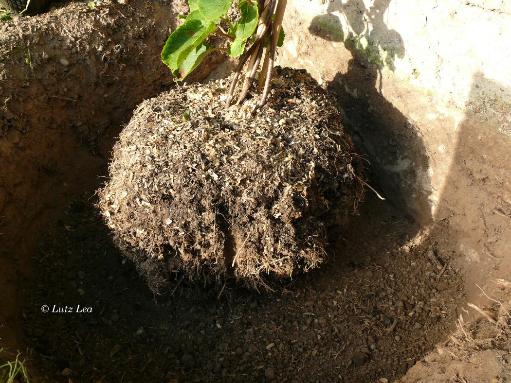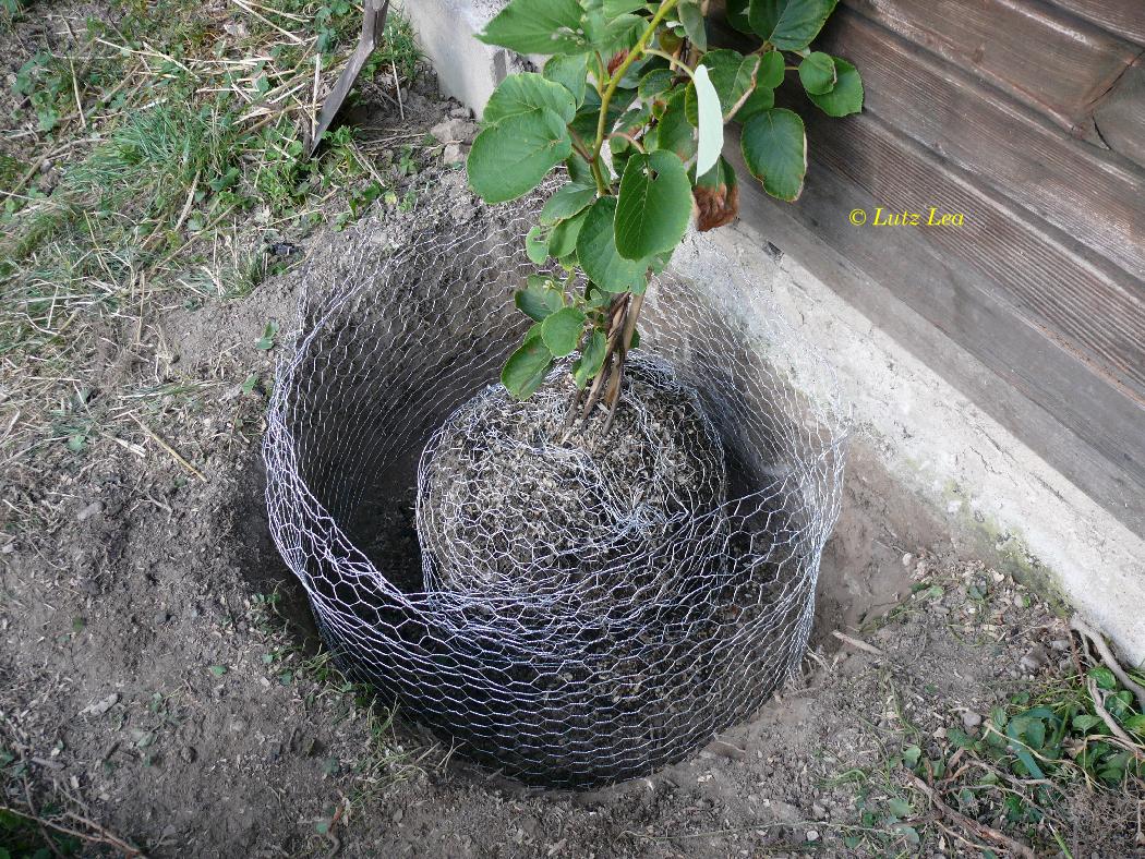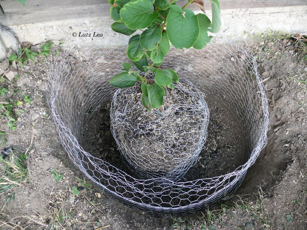 Doppelte Sicherheit - ich verlegte Draht um den Wurzelballen selbst und an der Außenseite des Pflanzloches.