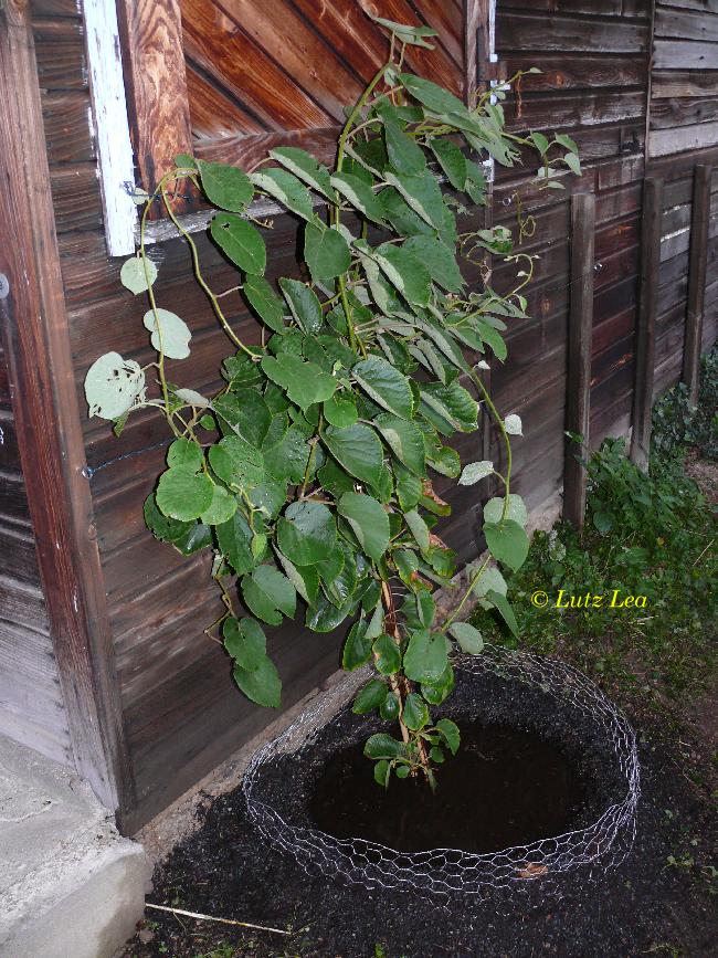 das ließ mir keine Ruhe - eine Kiwipflanze (zwittriges Exemplar) die ich im Frühjahr '07 auf der Westseite unseres Gartenhauses auf der "Ponderosa" auspflanzte machte einen oft schlappen Eindruck, wuchs schlecht und die Früchte wollten auch kaum größer werden.