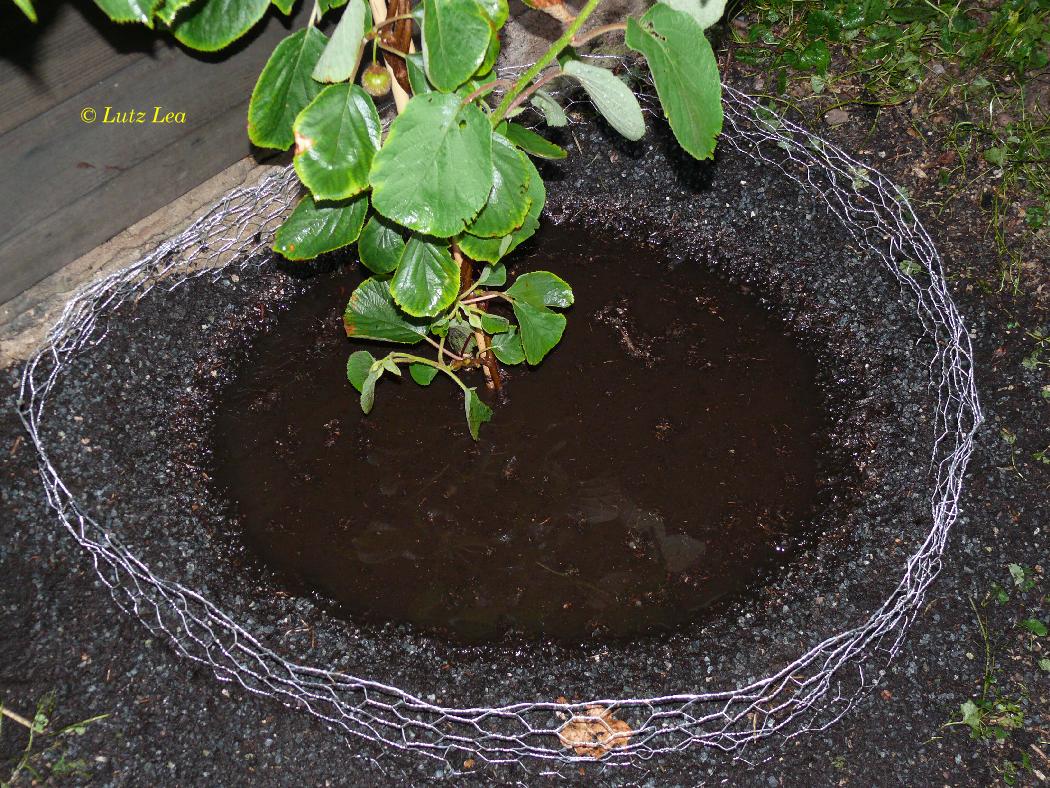 Den Draht habe ich extra ein wenig ober rausschauen lassen - da passt dann noch Mulch oder im Winter Laub rein.