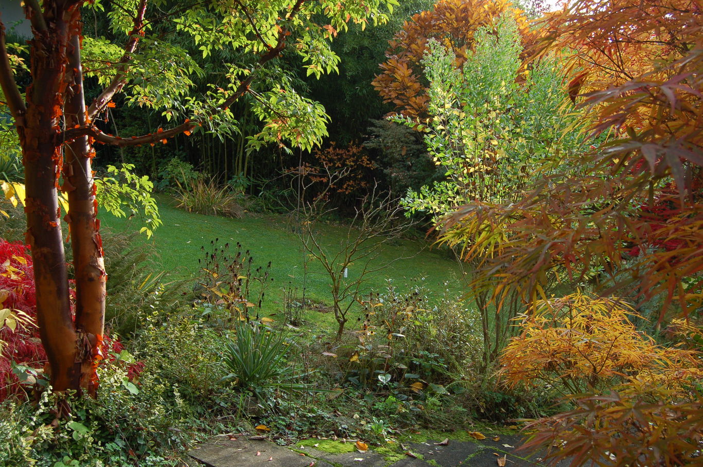 /*Acer griseum*/ sieht immer noch fast durchweg grün aus! Hinten in der Mitte färbt sich Quercus pontica langsam von Gelb nach Braun.#AM