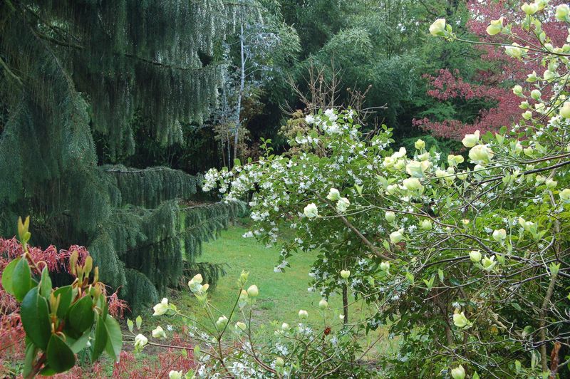 Nach einem Regenguss voll Wasser hängend: li Picea breweriana, hi Eucalyptus gunnii(Silver), re vorne mit den kl. weißen Blüten Osmarea burkwoodii(Extrem duftend!!) un re die wunderschöne cornus nuttallii Eddies White Wonder