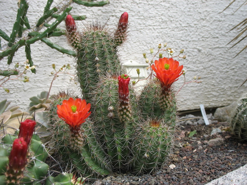 und jetzt auch in Blüte, der große Echinocereus coccineus/triglochidiatus im Hintergrund, nach dem Gregor nach der letzten Bildsequenz gefragt hatte - auch hier blüht ein Graptopetalum im Hintergrund