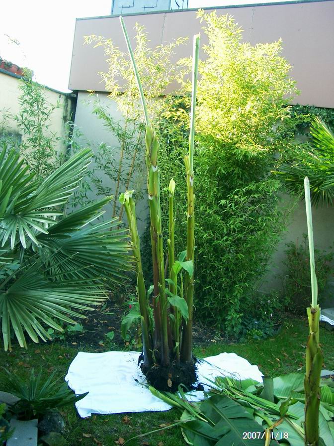 Musa Scheinstämme haben bei mir schon bis -7 Grad aushalten müssen,mit viel Schneefall.Meistens komme ich nicht dazu zum rechten Zeitpunkt die Musas zuzumachen.Wenn ich um 16:30 h von der Arbeit komme ist es schon zu dunkel.Wenn dann noch am Wochenende schlechtes Wetter herrscht,verzögert sich die ganze Sache manchmal doch erheblich.Meistens denke an Schutz erst im Dezember.Aber so spät kann ich nicht mit allen Pflanzen verfahren.Alles kommt nach und nach,immer ein bisschen zum Wochenende.