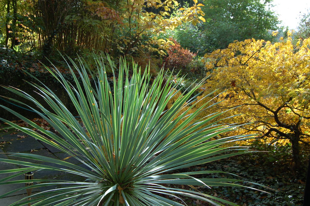 /*Acer palmatum dissectum viride*/ wird zunehmend orangegelb.Im Vordergrund Yucca rostrata
