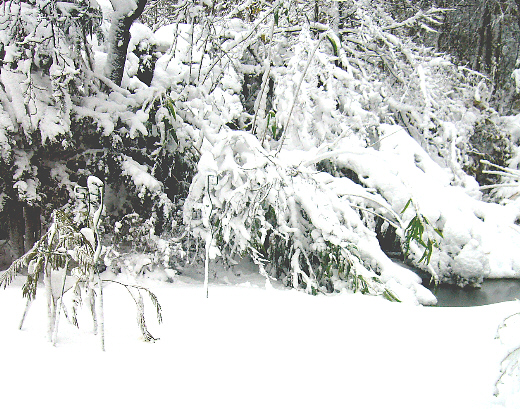 ...und links vorn Albizia julibrissin ‚Rosea’. Viele Gehoelze gingen zu Bruch, vor allem die Immergruenen, weil auf ihnen der inzwischen vereiste Schnee haftet. Am Wuchsort meiner Magnolia grandifloa ‚Victoria’ von fast 3 m Hoehe war heute nur ein großer Schneehaufen zu sehen. Sie ist halb durchgebrochen.