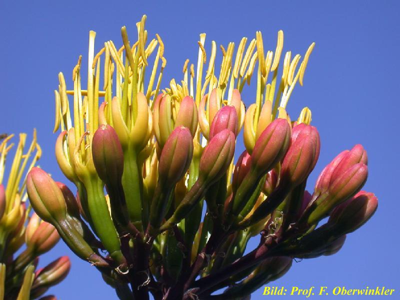 In mehreren Etagen erblühen von unten nach oben mehrere hundert Einzelblüten. Die festen gelben Staubblätter stehen aufrecht um den langen Griffel und ragen aus den fleischigen rötlichen Blütenblättern heraus; besonders vor blauem Himmel bieten die Blüten einen eindrucksvoll leuchtenden Kontrast. Damit macht diese Art dem Gattungsnamen Agave (griechisch: die Herrliche, die Prunkvolle) alle Ehre.