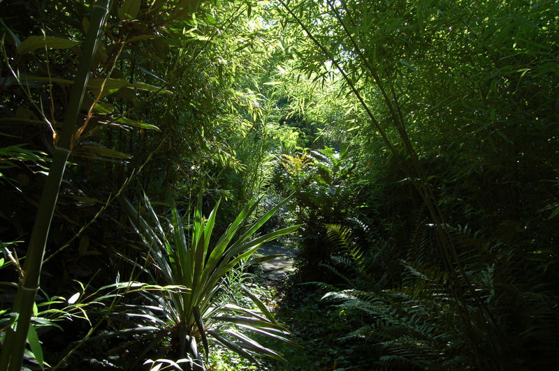 Erstaunlich, mit wie wenig Licht /*Yucca recurvifolia*/ auskommt.Dieser schmale Weg wird nur am späten vormittag "erhellt"