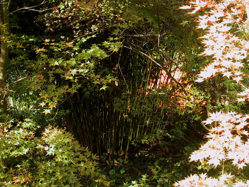 Zwischen Acer palmatum Sangokaku re und Acer p. Shindeshojo li /*Fargesia robusta*/ dahinter gelbrot schimmernd Acer p.diss.
