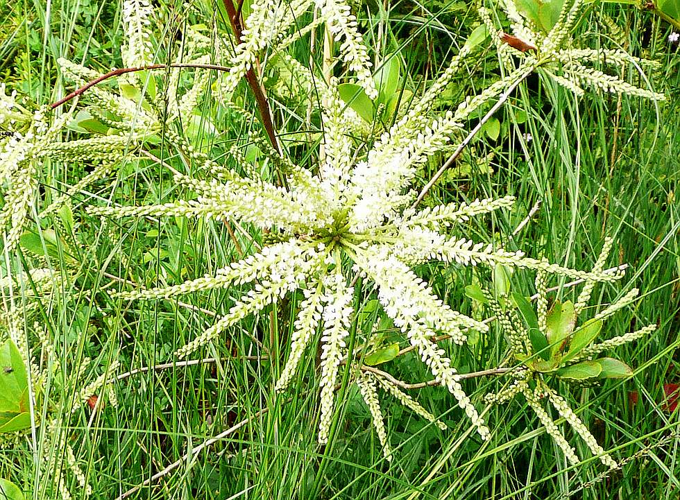 …ist /*Cyrilla racemiflora*/. Sie steht hier am Rande des Moorteichs, rechts davon die mit glänzenden Blättern immergrüne Lyonia ligustrina, dahinter (kaum erkennbar) Ledum macrophyllum (jetzt Rhododendron). An der linken unteren Ecke ist gerade noch ein Stückchen von Sarracenia purpurea erfasst. Das vorherrschende „Gras“ ist die sehr seltene Carex lasiocarpa.