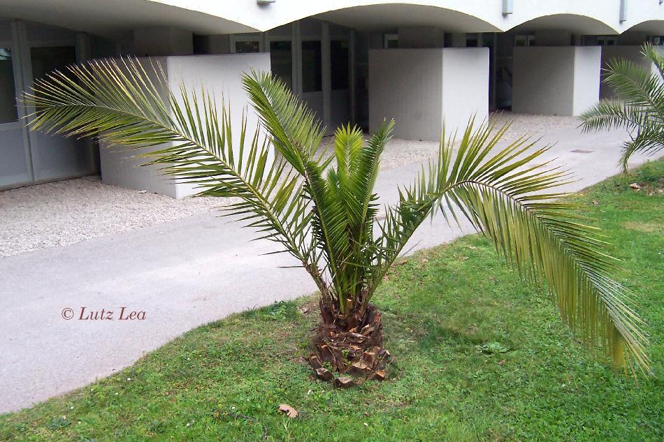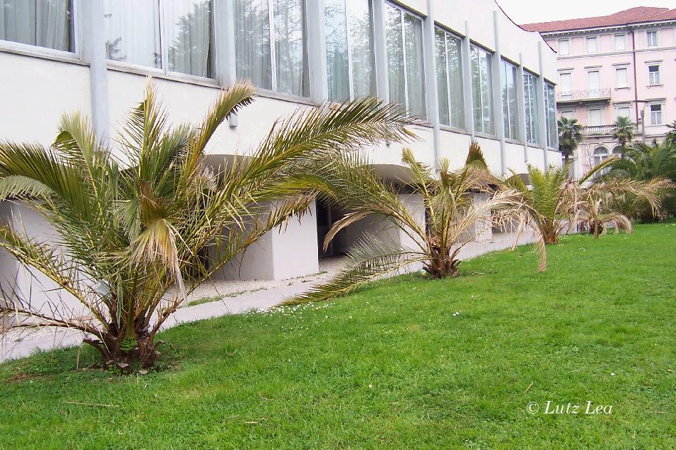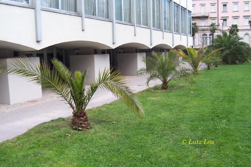 Nicht so ganz frosthart in 'Riva del Garda' ist 'Phoenix canariensis' etwas vom See entfernt gedeihend. So waren mehrere kleinere Phoenix-Palmen in der Nähe des gestern in Teil 13 vorgestellten Park des geschlossenen Hotel "Lido Palace" an Ostern 2006 ganz schön blattverfroren.