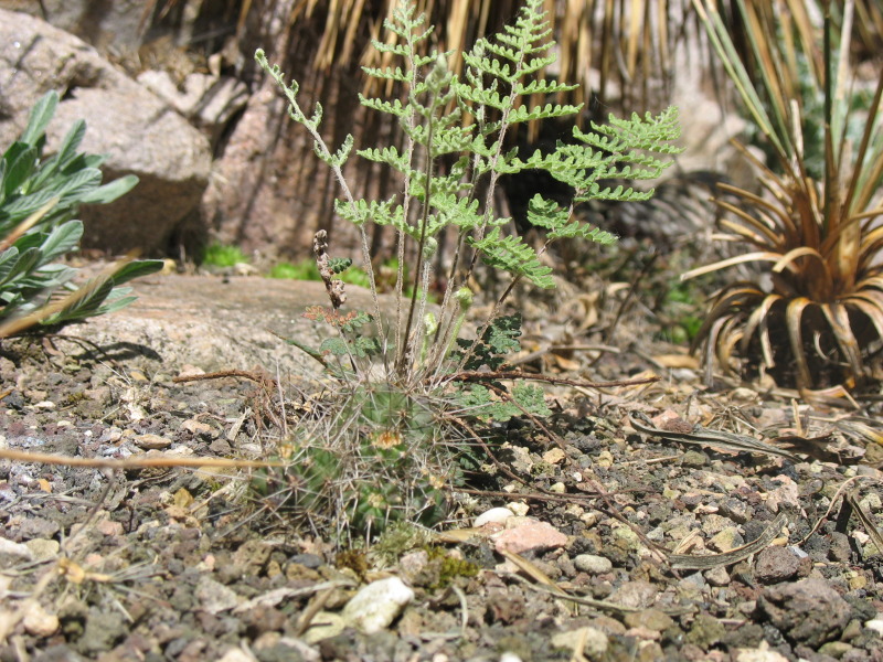 hat sich hier Cheilantes lanosa von der nicht weit entfernt stehenden Mutterpflanze. Hier wird baldiges Eingreifen erforderlich, denn der Kaktus dürfte dem Farn auf Dauer nicht gewachsen sein.