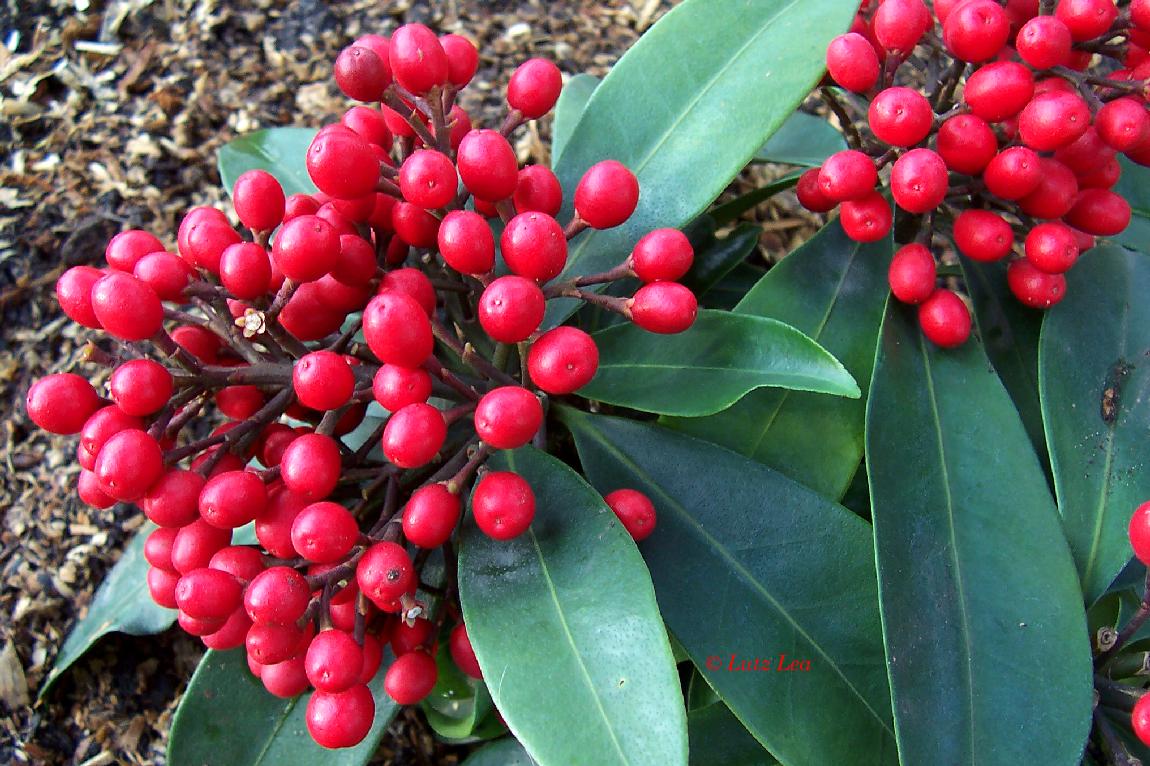 Nicht so leicht zu bekommen und als Kleinpflanze schon ziemlich teuer - die weibliche Form mit den tollen roten Fruchtständen von der Japanischen Skimmie 'Skimmia reevesiana'.